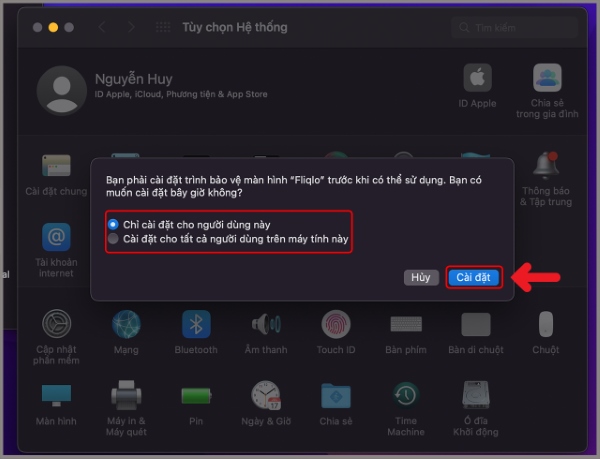 Bước 3: Sau đó hệ thống sẽ hỏi tài khoản đang sử dụng máy hay toàn bộ tài khoản trên máy tính này. Bạn chọn 1 trong 2 tùy chọn > nhấn tiếp vào Cài đặt.