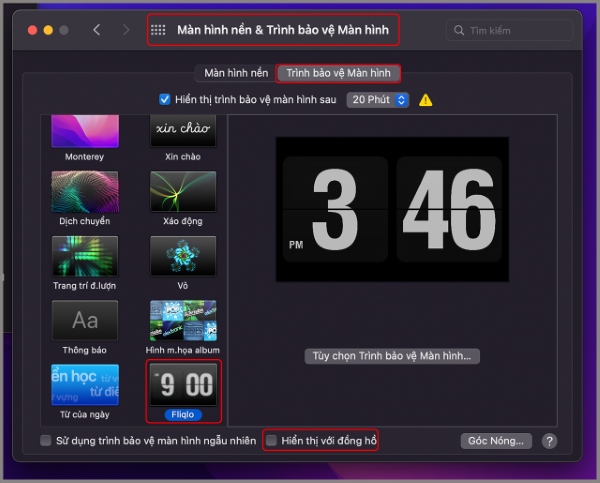 Bước 4: Sau đó đi tới vào Màn hình nền & Trình bảo vệ Màn hình > nhấn vào mục Trình bảo vệ màn hình > tại thanh bên trái bạn kéo xuống và chọn Fliqlo.