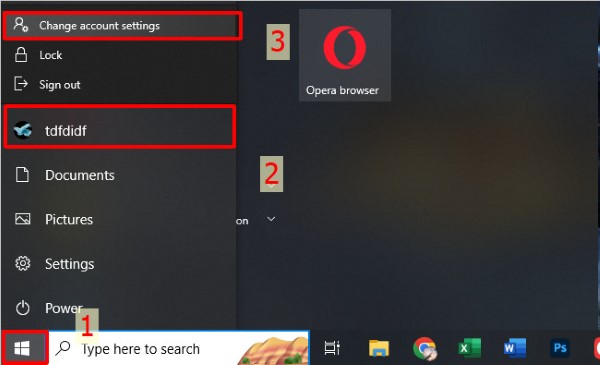 Bước 1: Truy cập Menu Start > Bấm chuột trái vào biểu tượng tài khoản > Chọn Change account settings.