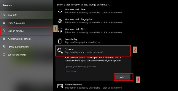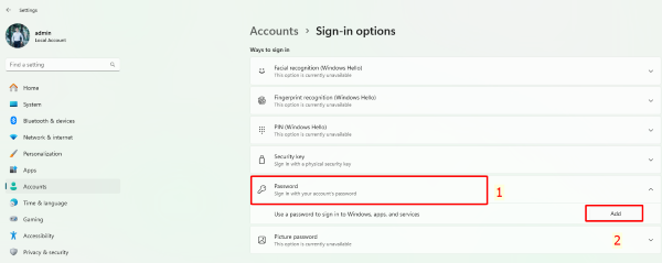 Bước 2: Chọn mục Sign-in options > Trong phần Password, nhấn Add.