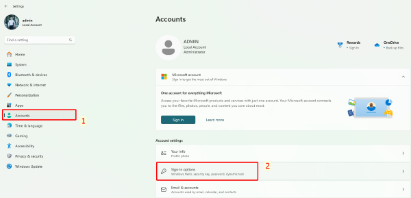 Bước 2: Truy cập Accounts > Tiếp tục chọn Sign-in options.