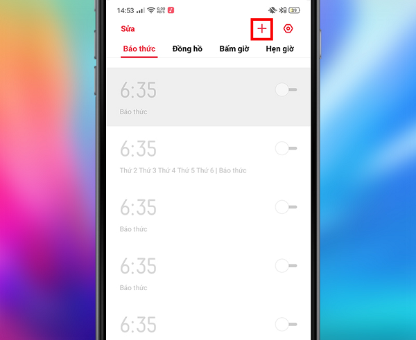 Bước 2: Chọn dấu cộng (+) để thêm cài đặt báo thức mới.