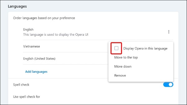 Tại danh sách ngôn ngữ, tìm và chọn Vietnamese. Sau đó, nhấn vào biểu tượng ba chấm bên cạnh → chọn Display Opera in this language để thiết lập hiển thị trình duyệt bằng tiếng Việt.