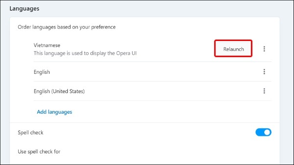 Opera sẽ tự động khởi động lại hoặc yêu cầu bạn nhấn Relaunch. Sau khi hoàn tất, toàn bộ giao diện sẽ hiển thị bằng tiếng Việt, giúp bạn thao tác dễ dàng hơn.