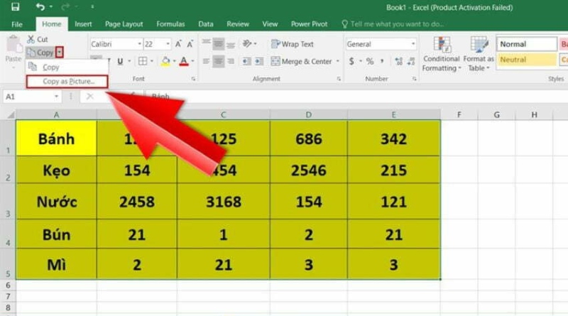 Đầu tiên chúng ta thực hiện mở file Excel cần thực hiện chuyển thành ảnh. Tiếp theo bôi đen phần dữ liệu muốn chuyển đổi rồi từ thanh công cụ chọn vào thẻ Home > Copy > Copy as picture.