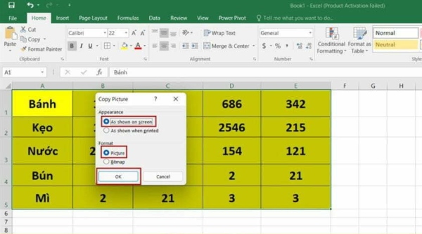Lúc này hộp thoại có tên Copy Picture hiện lên. Chọn vào phần As shown on screen và Picture, sau đó tiến hành chọn OK.