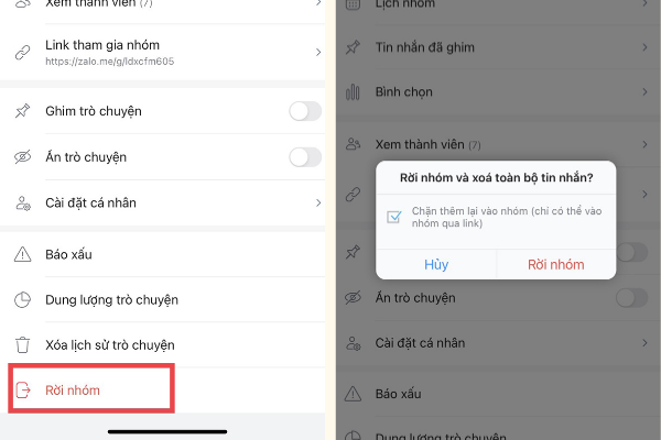 Bước 3: Nhấn chọn “Rời nhóm” > Lúc này, sẽ xuất hiện hộp thoại “Rời nhóm và xóa toàn bộ tin nhắn” > Tại đây sẽ xuất hiện một ô “Chặn thêm lại vào nhóm” (chỉ có thể thêm vào nhóm qua link) > lúc này bạn sẽ nhấn vào ô này > Nhấn “Rời nhóm” để xác nhận.