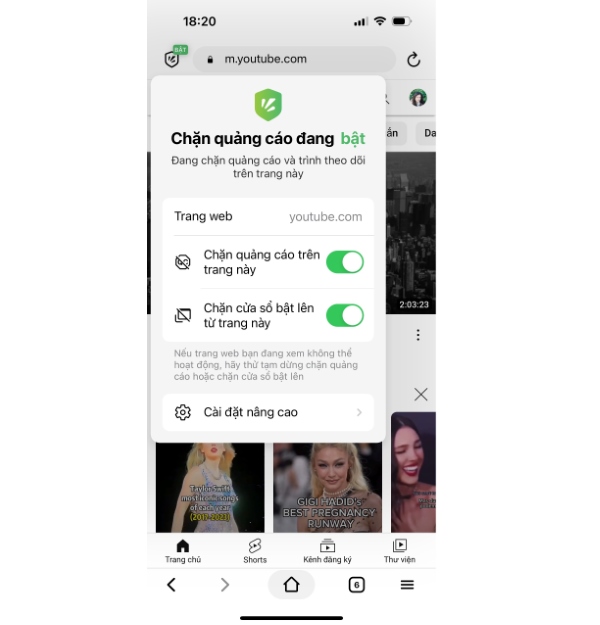 Bạn nhấn vào biểu tượng Chặn quảng cáo (chiếc khiên) > chọn Cài đặt nâng cao (bánh răng)