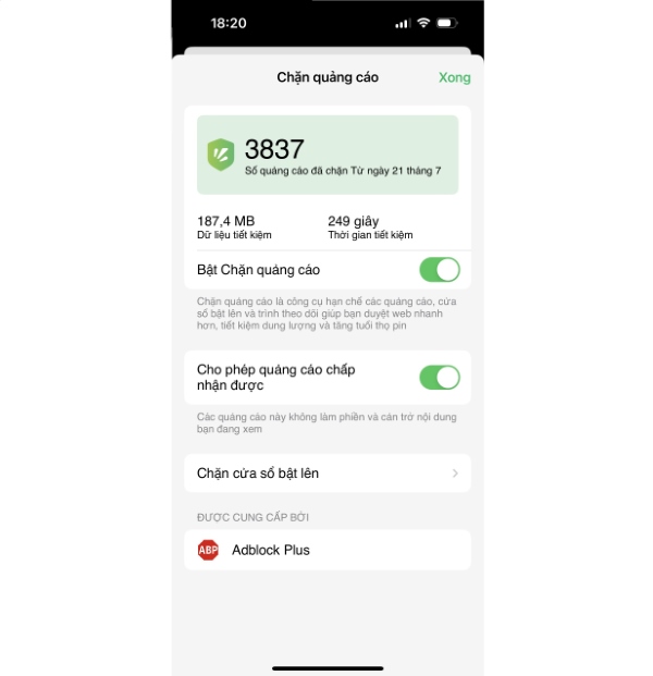 Chọn bật chế độ Bật Chặn quảng cáo và Cho phép quảng cáo chấp nhận được