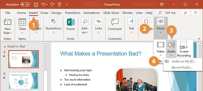 Bước 2: Tại thanh công cụ ribbon, hãy chọn thẻ Insert, rồi bấm nút Media trong menu xổ xuống và chọn Audio.