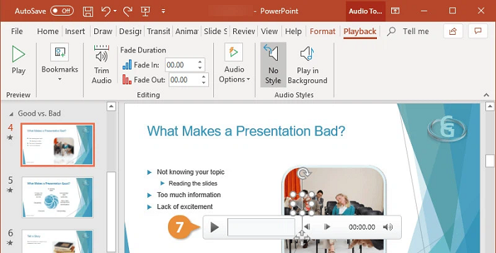 Bước 4: Tệp âm thanh sẽ xuất hiện trên trang slide của PowerPoint dưới dạng một thanh media nhỏ. Đồng thời, tab Playback sẽ xuất hiện trên thanh công cụ ribbon, nơi bạn có thể điều chỉnh âm thanh được chèn vào. Hãy kích giữ vào thanh media này và di chuyển đến vị trí bất kỳ của slide mình muốn rồi bấm nút Play để kiểm tra âm thanh của tệp âm thanh vừa chèn vào.
