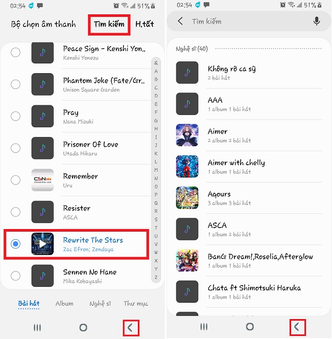 Bước 6: Sau khi nhấn vào nút “+” các bạn có thêm bất kỳ bài hát nào có trong thư viện âm nhạc của bạn. Nếu có quá nhiều bài bạn có thể tìm kiếm chúng theo tên bài hát. Sau khi đã chọn được bài hát lại bấm vào nút “<” để quay lại màn hình trước đó.