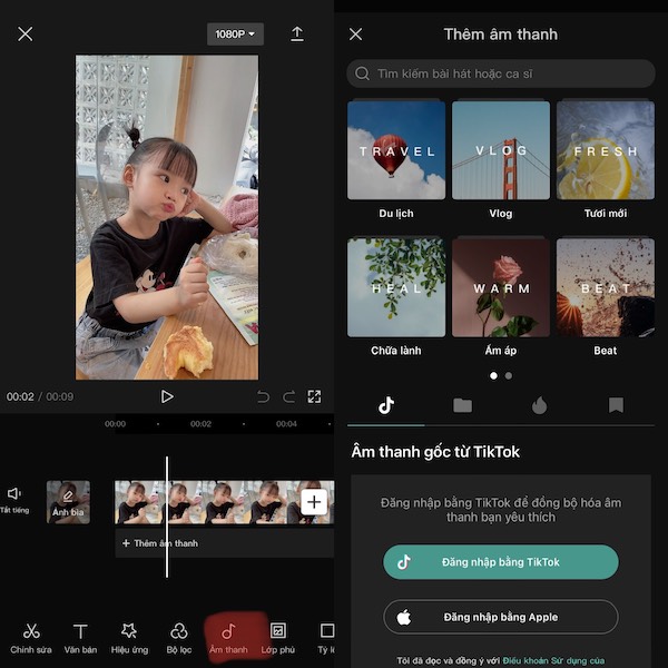 Với âm thanh có sẵn trên Capcut, thì được chia làm nhiều chủ đề: Du lịch, Tươi mới, Vlog, Chữa lành, Ấm áp và Beat.