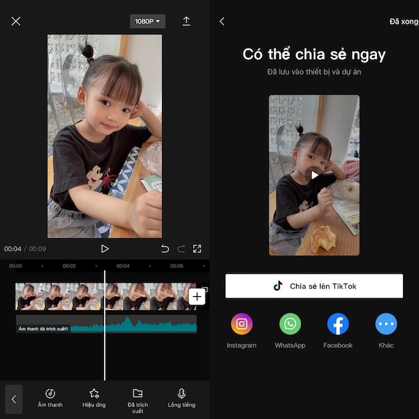 Bước 4: Sau khi hoàn thiện các chỉnh sửa bạn có thể xuất video hoăc chia sẻ trực tiếp trên các nền tảng.
