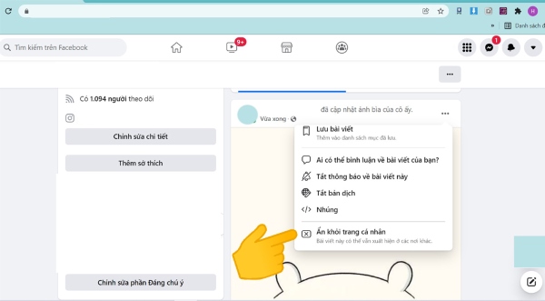 Bước 3: Tiếp theo, bạn vào bài đăng cập nhật ảnh bìa của mình và chọn vào biểu tượng dấu ba chấm rồi chọn Ẩn khỏi trang cá nhân.