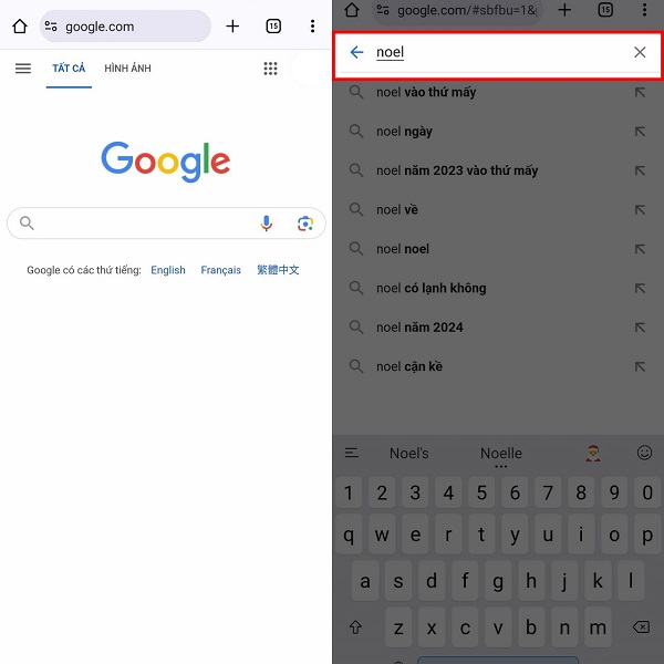 Đầu tiên, bạn cần truy cập vào trang chính của Google hoặc nhấn vào đường link: https://www.google.com/. Sau đó, nhập các từ khóa liên quan đến giáng sinh như Noel vào ô tìm kiếm của Google.