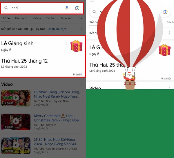 Màn hình sẽ hiển thị kết quả tìm kiếm, bạn sẽ thấy hình ảnh một hộp quà cùng dòng chữ Lễ Giáng Sinh, hãy kích vào hộp quà đó. Lúc này, sẽ có một chiếc khinh khí cầu bay lên chở theo ông già Noel và bạn có thể tham gia các trò chơi của Google rồi đấy.
