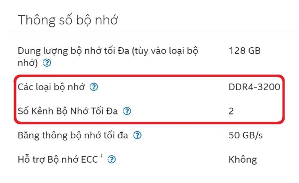 Ví dụ, tại mục Thông số bộ nhớ của chip Intel Core-i5 11400, bạn sẽ xem được các thông tin như Các loại bộ nhớ và Số Kênh Bộ Nhớ Tối Đa để biết bộ vi xử lý này tương thích với RAM DDR4-3200 và hỗ trợ 2 kênh bộ nhớ (Dual). Người dùng cần tìm kiếm bộ RAM mới theo các chỉ số này để đảm bảo khả năng tương thích chắc chắn với CPU.