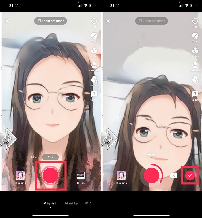 Bước 2: Sau khi đã chọn được hiệu ứng xong bạn hãy nhấn vào nút tròn màu đỏ trên màn hình để quay video. Muốn ảnh được cắt từ video sắc nét bạn cần phải làm một việc là giữ điện thoại thật chắc chắn, tránh bị rung lắc.