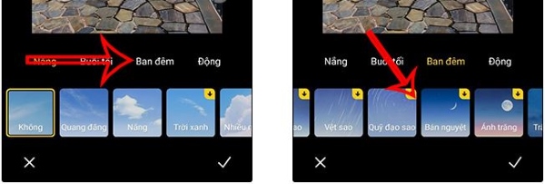 Bước 2: Tại đây bạn sẽ thấy có nhiều cảnh chỉnh bầu trời khác nhau, hãy chọn vào hiệu ứng Ban đêm để chỉnh sửa với cảnh bầu trời ban đêm phù hợp.