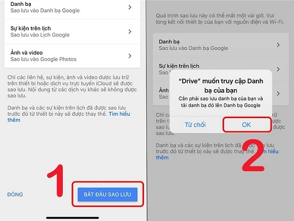 Bước 4: Tại bước này bạn chọn Bắt đầu sao lưu/ OK để tiến hành cấp quyền cho Google Drive.