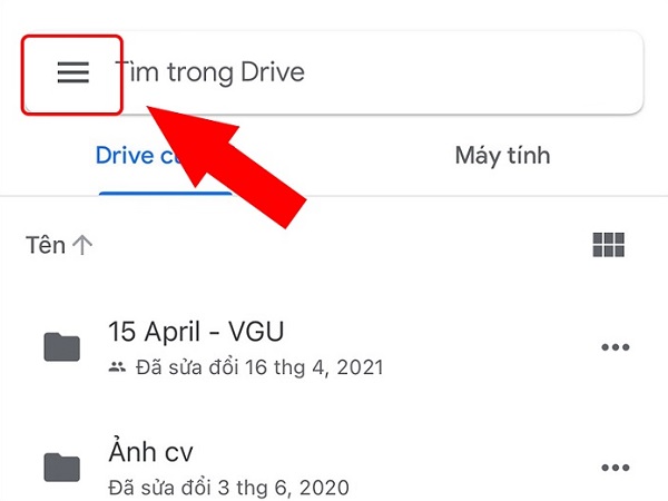 Bước 1: Tại giao diện Google Drive, bạn click vào biểu tượng 3 dấu gạch ngang ở góc bên phải của màn hình.