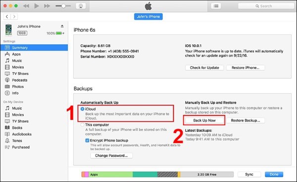 Bước 2: Chọn iCloud làm nơi lưu trữ dữ liệu > Nhấn Back Up Now và chờ sao lưu hoàn tất.