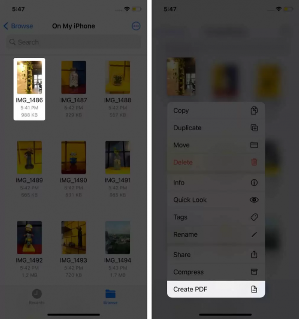 Bước 2: nhấn giữ vào hình ảnh muốn chuyển sang PDF. Màn hình sau đó sẽ hiển thị danh sách các tùy chọn. Bạn nhấn vào “Create PDF” (Tạo PDF) để chuyển ảnh sang PDF trên iPhone.