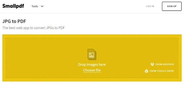 Phần mềm chuyển ảnh sang PDF SmallPDF là một phần của bộ công cụ chuyển đổi online lớn khác. Bạn có thể chuyển ảnh sang PDF trực tiếp bằng cách upload từ máy tính, Google Drive hoặc Dropbox. Người dùng cũng có thể upload một lần nhiều hình ảnh lên để chuyển định dạng nhanh chóng.