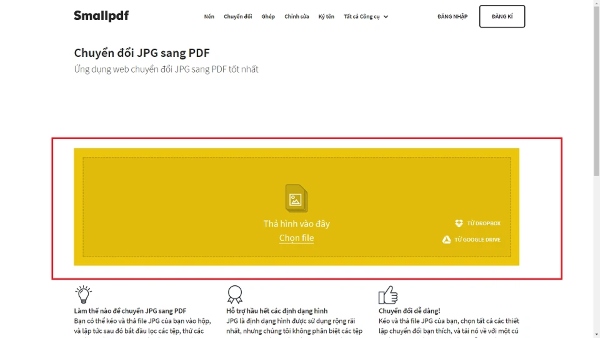 Bước 1: Để chuyển ảnh sang PDF online, bạn truy cập vào trang web SmallPDF và nhấn vào khu vực màu vàng để tải lên hình ảnh muốn chuyển sang file PDF.