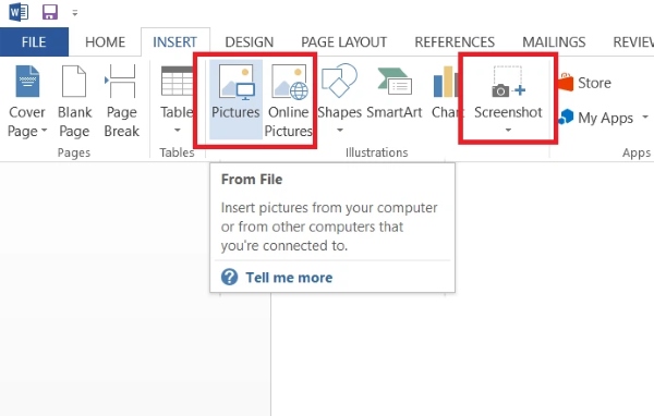 Bước 1: Mở Microsoft Word và thêm ảnh muốn chuyển sang PDF bằng một trong các cách sau: Chèn ảnh sẵn có trên máy tính, chèn ảnh online hoặc ảnh chụp màn hình trong tùy chọn Screenshot.