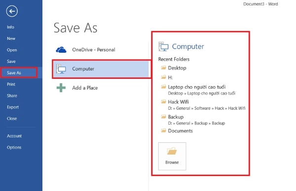 Bước 3: Nhấn vào tab Save As chọn Computer hoặc OneDriver mong muốn sau đó bạn chọn vị trí trên máy tính mà bạn muốn lưu file. Tại giao diện tùy chọn, phần mềm gợi ý những folder bạn vừa sử dụng gần đây, người dùng có thể nhấn vào Browse để chọn vị trí mong muốn.