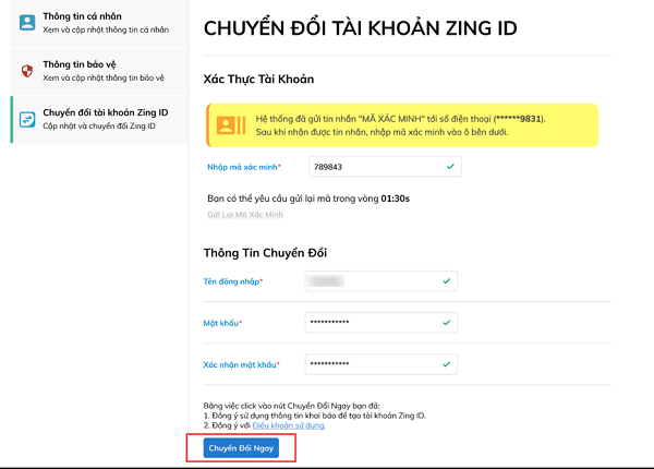 Lúc này bạn chỉ cần nhấn vào nút “Chuyển đổi ngay” sau khi đã kiểm tra tất cả thông tin tài khoản đó là chính xác. Sau đó hệ thống sẽ tiến hành gửi tin nhắn thông báo chuyển đổi tài khoản thành công.