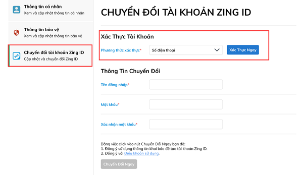 Tại mục “Chuyển đổi tài khoản Zing ID” bạn cần nhập thông tin tài khoản và mật khẩu Zing ID mà mình muốn chuyển đổi (lưu ý tài khoản này chưa từng tồn tại).