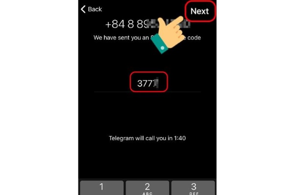 Bước 5: Tiếp theo bạn nhập mã code được Telegram gửi về số điện thoại của bạn.