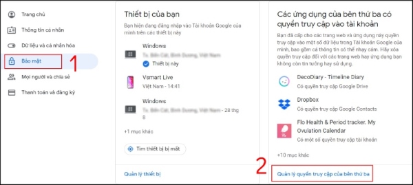 Bước 1: Tiến hành truy cập vào trang quản lý tài khoản Google TẠI Đ Y > Chọn vào tính năng Bảo mật ở phía góc trái > Kéo chuột tới chọn mục Các ứng dụng của bên thứ ba có quyền truy cập tài khoản của bạn, chọn vào phần Quản lý quyền truy cập của bên thứ ba.