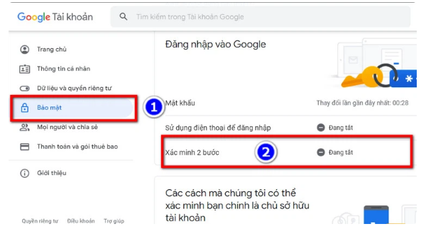 Bước 3: Chọn vào Bảo mật ở vị trí khung bên trái, ở khung phải bạn tiến hành di chuyển xuống và tìm mục Đăng nhập vào Google. Tại đây bạn thấy tính năng Xác minh 2 bước được tắt, hãy kích vào tính năng này này để truy cập giao diện trang cài đặt.