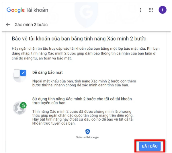 Bước 4: Chuyển sang giao diện Xác minh 2 bước, chọn vào Bắt đầu để tiếp tục.