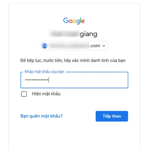 Google sẽ yêu cầu xác minh bằng cách nhập mật khẩu tài khoản gmail vào khung trống tiếp tục chọn Tiếp theo.