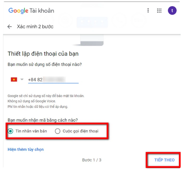 Đây là số điện thoại mà Google xác minh và bảo mật tài khoản. Sau khi nhập số điện thoại hãy chọn cách để nhận mã xác minh. Có thể là bằng Tin nhắn văn bản hoặc Cuộc gọi điện, tùy vào bạn. Sau chọn Tiếp theo để tiếp tục.