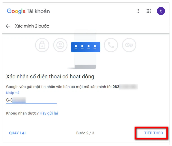 Bước 6: Google sẽ gửi mã xác nhận qua số điện thoại mà bạn đăng ký. Bây giờ bạn chỉ cần nhập mã xác nhận vào khung trống. Sau đó chọn Tiếp theo.