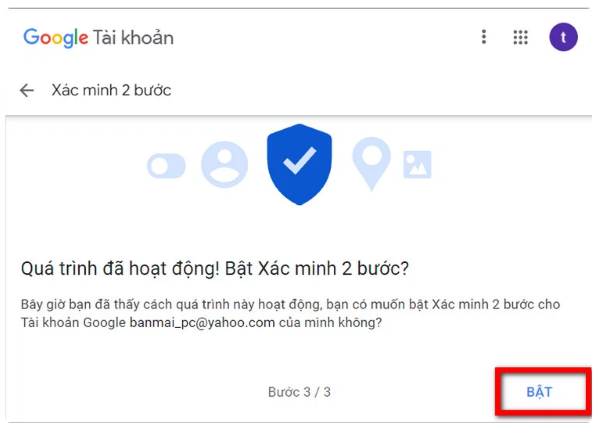 Bước 7: Lúc này Google sẽ thông báo cho biết Quá trình hoạt động và tùy chọn bấm nút Bật để bật tính năng xác minh 2 bước và kết thúc thiết lập.