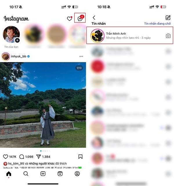 Bước 1: Để bắt đầu cách đặt biệt danh trên Instagram cho người khác, hãy mở ứng dụng Instagram trên điện thoại của bạn > Chạm vào biểu tượng Tin nhắn ở góc trên cùng màn hình > Chọn cuộc trò chuyện với người mà bạn muốn đặt biệt danh.