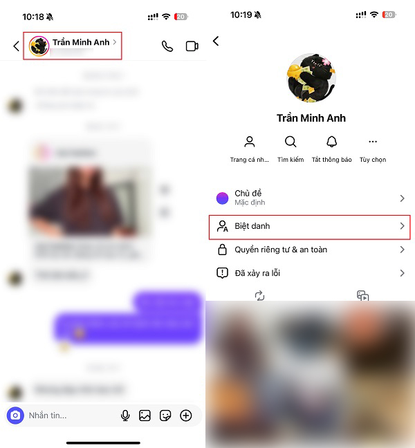Bước 2: Nhấn vào phần tên của người đó trong khung trò chuyện như hình minh họa để bắt đầu thay đổi biệt danh > Tiếp tục chọn mục “Biệt danh”.