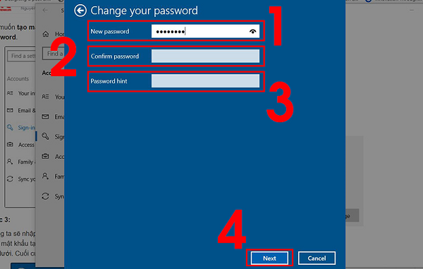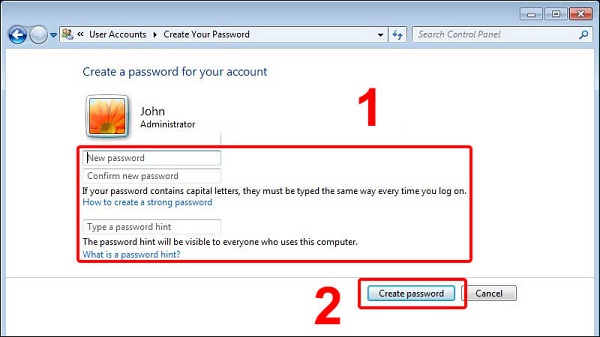 Type a password hint: gợi ý cho mật khẩu nếu như trong trường hợp người dùng quên, có thể điền vào ô này hoặc không.
