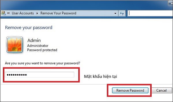 Bước 3: Người dùng hãy nhập mật khẩu đang có trên máy tính chạy windows 7 vào rồi sau đó nhấn vào ô Remove password để xác nhận việc xóa mật khẩu trên máy tính của mình.