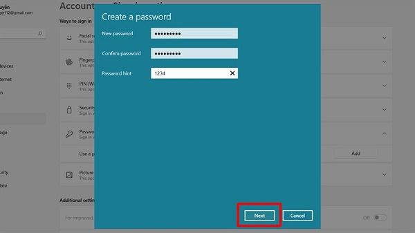 Sau khi đã lựa chọn được cách thức mở khóa thì máy tính sẽ yêu cầu người dùng tạo mật khẩu cho máy tính. Người dùng hãy nhập đầy đủ các trường mật khẩu của mình >> xác nhận mật khẩu. Còn đối với mục gợi ý mật khẩu thì người dùng có thể đánh gợi ý phòng trường hợp khi quên mật khẩu máy. Sau đó nhấn Next >> Finish là xong nhé.