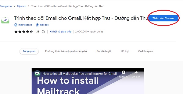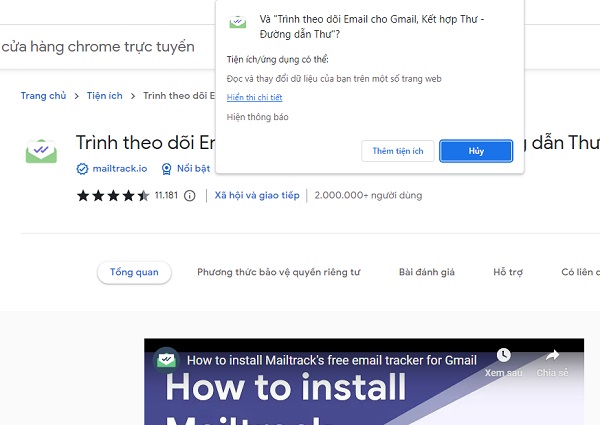 Bước 1: Bạn cần tích hợp tiện ích Mailtrack vào trình duyệt máy tính của mình. Cách thực hiện rất đơn giản, mở trình duyệt máy tính lên -> Chọn vào biểu tượng 3 chấm góc trên cùng bên phải -> chọn “Tiện ích mở rộng” -> chọn “Truy cập cửa hàng Chrome trực tuyến” -> Nhấn vào ô tìm kiếm gõ từ khóa “Mailtrack extension” -> chọn tiện ích -> chọn “Thêm vào Chrome” -> chọn “Thêm tiện ích”
