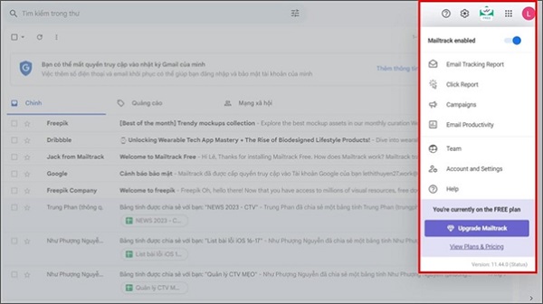 Bước 4: Sau khi mở email lên bạn sẽ nhìn thấy logo của tiện ích Mailtrack góc trên cùng bên phải màn hình -> nhận vào logo này -> bật “Mailtrack enabled”.