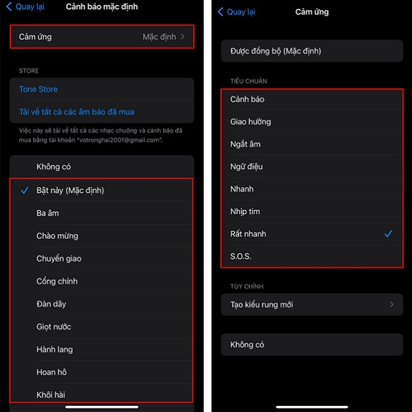 Bước 2: Tại mục “Cảnh báo mặc định” bạn có thể thoải mái lựa chọn âm thanh mình thích. Bên cạnh đó, bạn có thể chuyển đổi chế độ rung bằng việc chọn vào mục “Cảm ứng” và sau đó chọn kiểu rung bạn thích.
